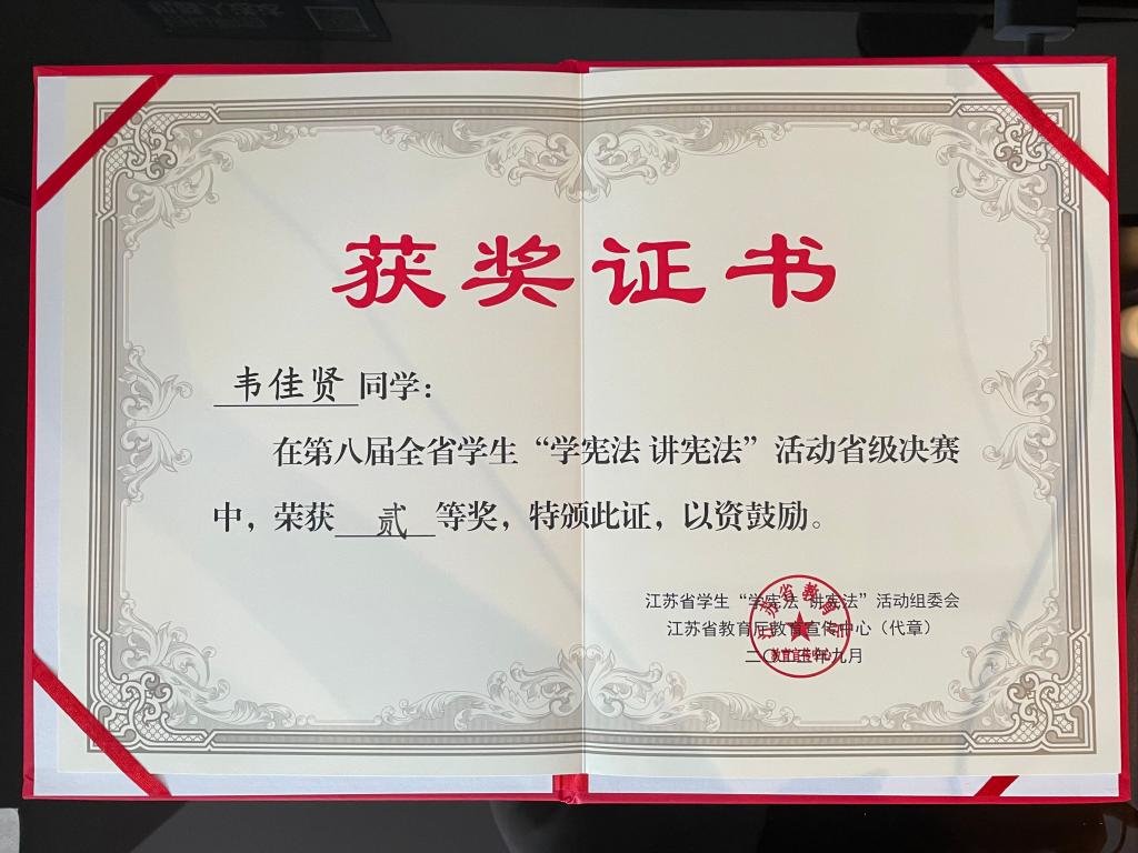 为全面学习贯彻党的二十大精神,深入学习贯彻习近平法治思想,推动青少年宪法宣传教育常态化长效化,9月23—24日,第八届江苏省学生“学宪法 讲宪法”活动省级决赛在南京举行。taptap语言文化学院秘书2122韦佳贤同学参加高校组演讲比赛,获得省级二等奖。