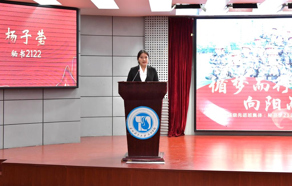 国家奖学金获得者、秘书学2122班班长韦佳贤同学分享了自己的成长经历,江苏省先进集体代表、秘书学2122班团支书杨子莹同学分享了班级的建设经验与先进事迹。