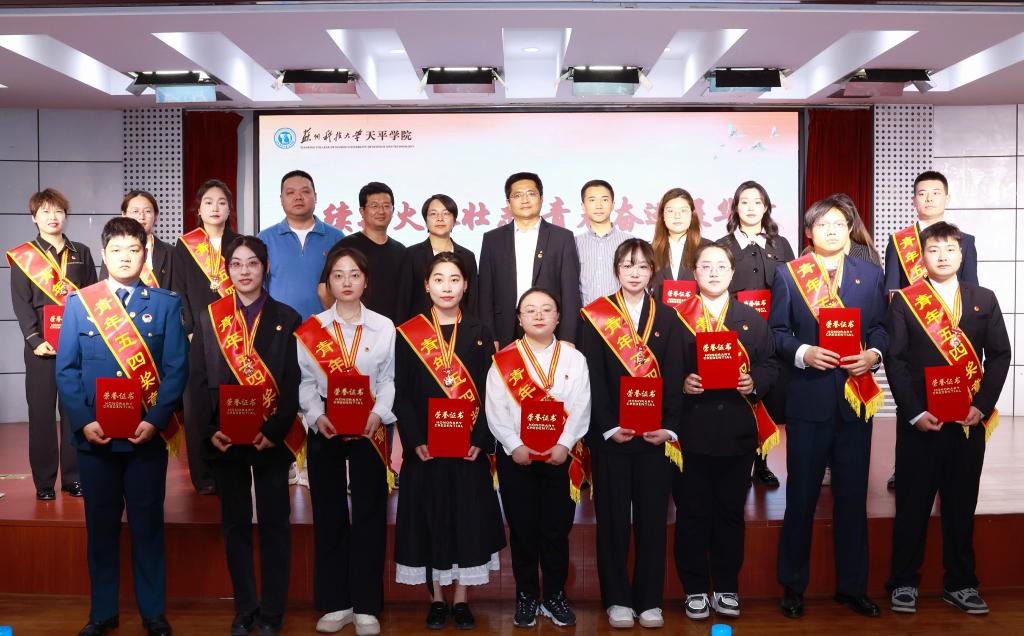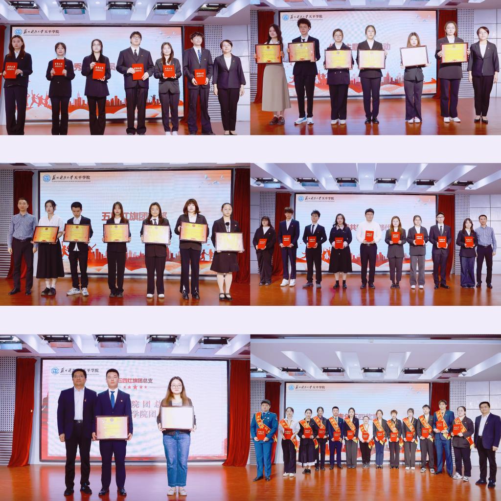 院团委书记刘亚男宣读了《关于表彰2024年度院“五四红旗团总支”“青年五四奖章”等先进集体和优秀个人的决定》。智能制造学院团总支、管理学院团总支荣获2024年度院“五四红旗团总支”称号,商务英语2221团支部等17个团支部荣获2024年度院“五四红旗团支部”称号,孙恒等14名青年荣获2024年度院“青年五四奖章”称号,刘建琦等54名青年荣获2024年度院“优秀共青团干部”称号,蔡菊等94名同学荣获2024年度院“优秀共青团员”称号,英语2323团支部“心若石榴籽,蔓延团结情”等8个项目荣获“优秀主题团日活动”。现场领导为获奖集体和个人代表颁发荣誉证书、奖状。