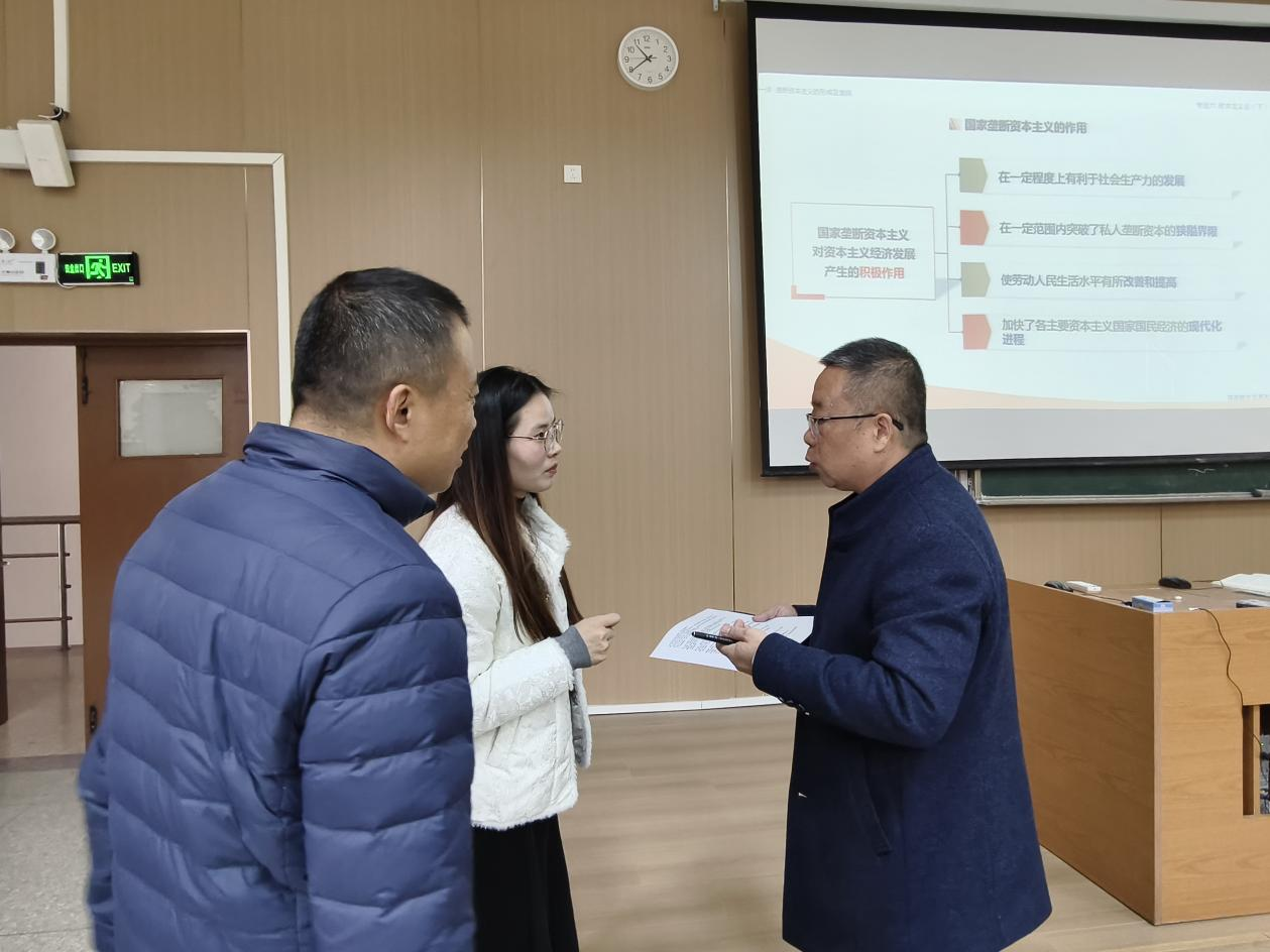 课间,陆启义教授与叶慧老师进行了深入交流。他对授课教师扎实的理论功底、认真的教学态度以及富有启发性的教学设计给予了充分肯定,特别指出“学生课前问题清单”这一环节有效衔接了学情与教学内容。同时,结合当前思政课改革前沿与教学实际,陆启义教授就如何进一步增强教学案例的时效性与针对性、创新互动模式以提升课堂吸引力、深化理论阐释的生动性与透彻性等方面,提出了具体而中肯的改进建议。叶慧老师表示,专家的点评精准透彻,为其后续优化教学提供了清晰的方向和宝贵的思路。