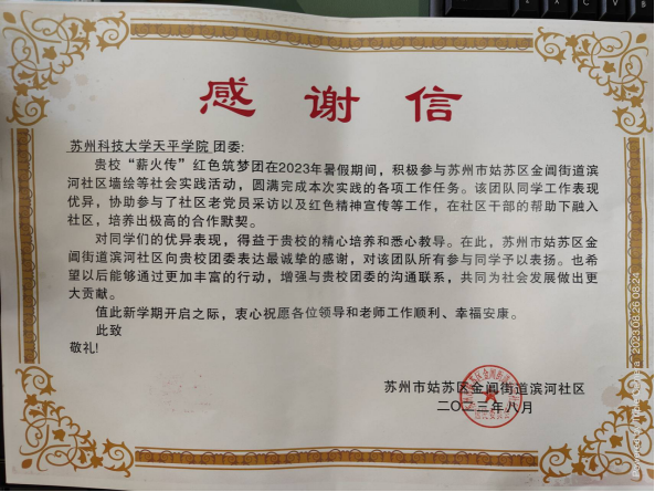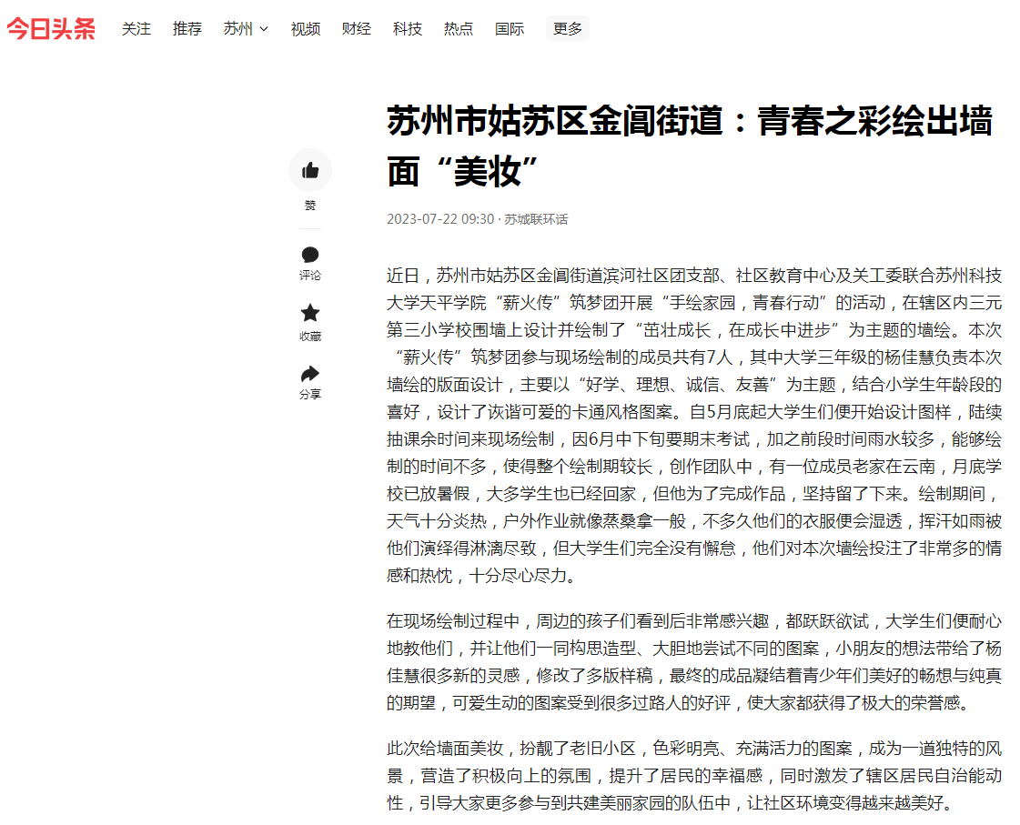 “薪火传”红色筑梦团队围绕重走红色足迹、追溯红色记忆、访谈红色人物、挖掘红色故事、体悟红色文化等主题,开展了走访红色教育基地、手绘社区墙绘、制作社区红色人物事迹宣传手册等特色活动,今日头条、搜狐等媒体对团队的手绘社区墙绘活动进行了宣传报道,姑苏区金阊街道滨河社区也为团队发来了感谢信,团队手绘墙绘的新闻也在中青校园APP上进行了发表。