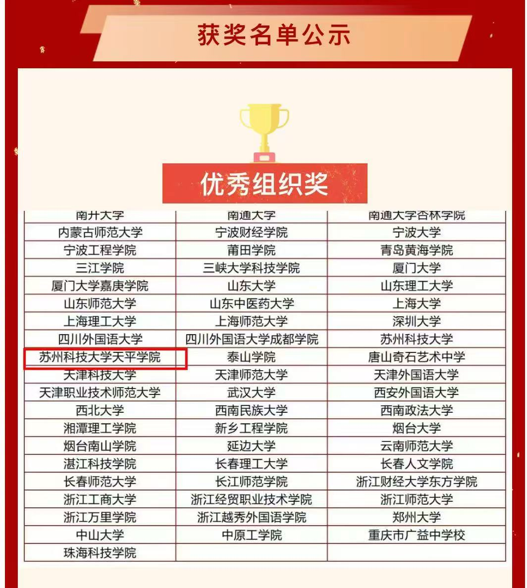 本次大赛吸引了来自南京大学、复旦大学和日本北洋大学等国内外700多所高校、企事业单位的近万名选手参赛。在师生的共同努力下,taptap学子在此次大赛中获得多个奖项,其中张婷、孙硕荣获本科组汉译日组三等奖;刘孟璇、李翔宇、范娅、孙敏荣获本科组日译汉二等奖;彭意、黄颖、刘心雨、龙云、赵莎莎荣获本科组日译汉三等奖。指导教师汪菲、刘畅、曹颖、刘凯荣获“优秀指导教师”荣誉称号。此外,taptap荣获第七届“人民中国杯”日语国际翻译大赛优秀组织奖。