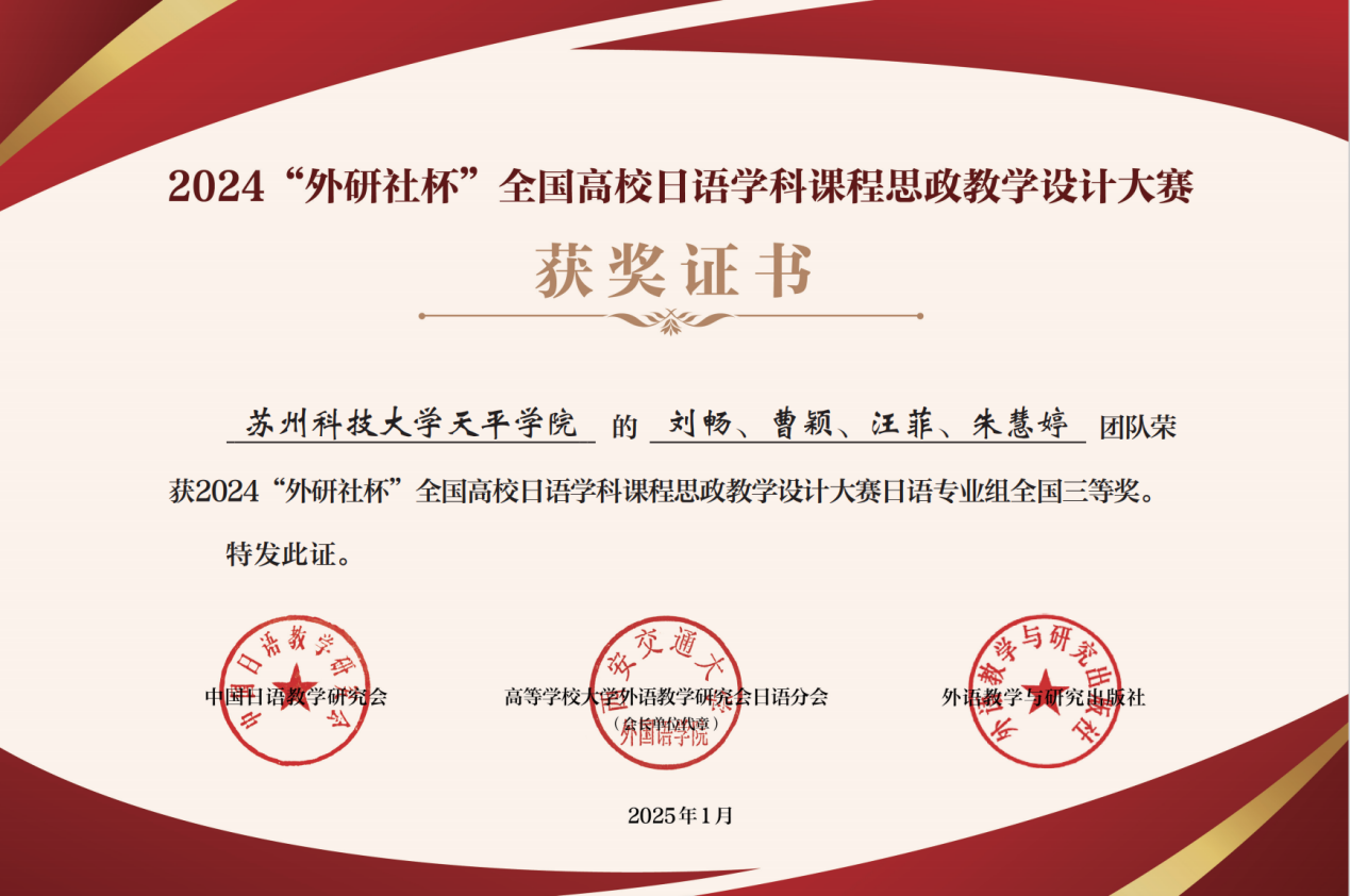 近日,2024“外研社杯”全国高校日语学科课程思政教学设计大赛落下帷幕。taptap语言文化学院教师刘畅、曹颖、汪菲、朱慧婷荣获日语专业组全国三等奖。