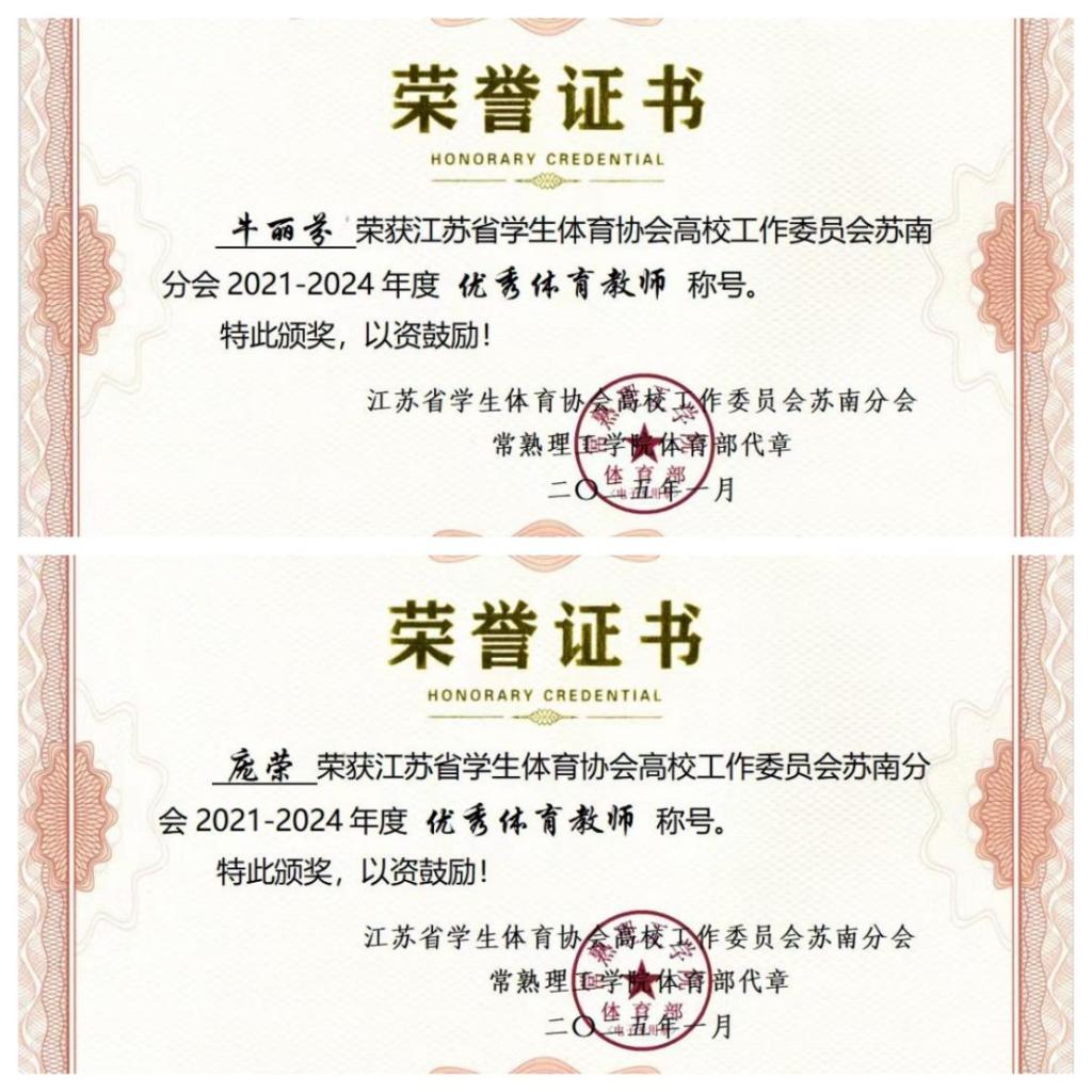 近日,江苏省学生体育协会高校工作委员会苏南分会2021-2024年度优秀教师评选结果揭晓,taptap公共教学部牛丽芬、庞荣两位教师获评“苏南高校优秀体育教师”称号。此次评选,意在表彰在学校体育教育教学和人才培养工作中取得突出业绩的优秀体育教师。