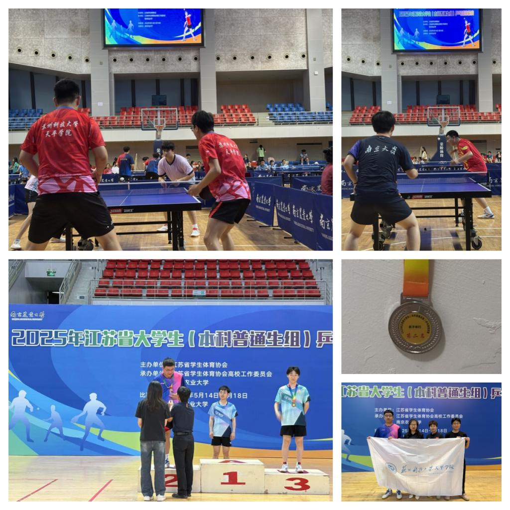 近日,江苏省大学生乒乓球锦标赛本科院校组比赛在南京农业大学落下帷幕,本次比赛共有省内46所本科院校350人参赛。钱志君、李旺泽两位同学在牛丽芬、庞荣两位老师的带领下代表学院参赛。在男子单打比赛中,钱志君同学一路过关斩将,凭借扎实的基本功、出色的战术运用以及坚韧不拔的毅力,成功闯入决赛,最终荣获亚军。在男子双打比赛中,钱志君和李旺泽两位同学配合默契,凭借出色的团队协作和精湛的球技,成功闯入16强。