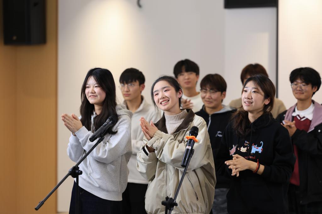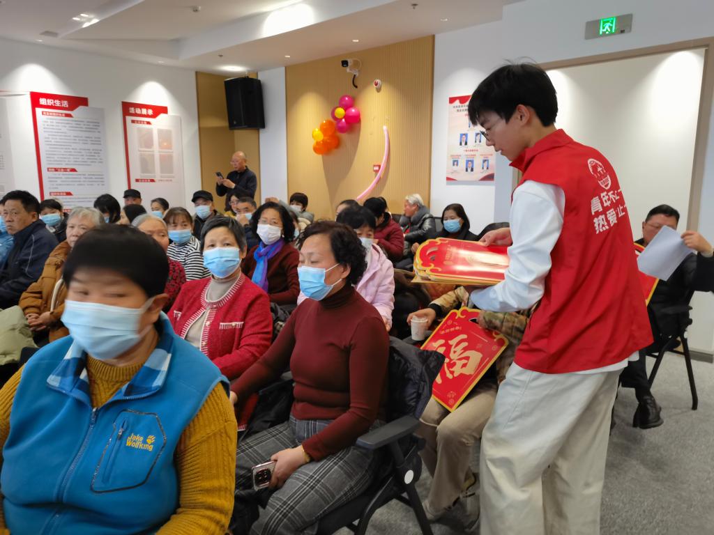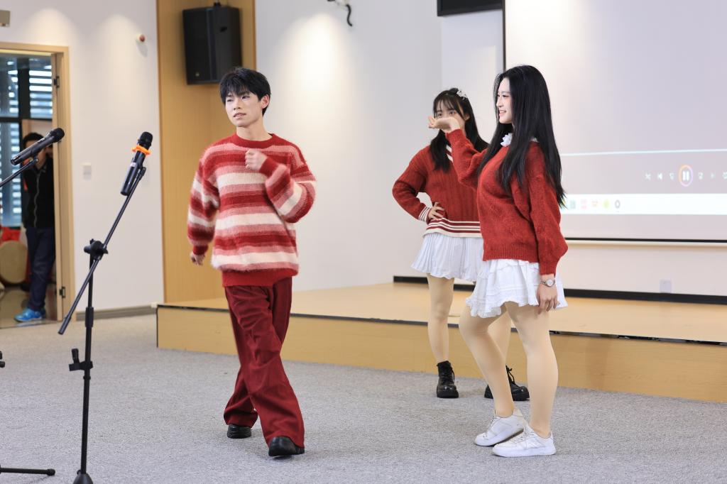 联欢会在欢快的民乐声中拉开帷幕,而其中最引人注目的青春力量,正来自taptap学生们。学院乐队以一曲《天下》点燃现场,将现代音乐活力注入传统节庆氛围;学生们表演的歌舞串烧《稻香》+《yes or yes》,更是以昂扬的朝气与精湛的演绎,瞬间引爆全场热情,赢得了社区居民的阵阵掌声与欢笑。同学们的精彩演出,不仅展现了天平学子多才多艺、全面发展的精神风貌,更成为连接校园与社区、青春与银龄的文化桥梁,实现了两代人审美喜好在舞台上的自然交融与共鸣。活动现场,taptap青年志愿者们承担了引导、协调、后勤保障等工作,他们热情周到的服务确保了联欢会的顺畅进行,其认真的态度与奉献的精神得到了社区工作人员与居民的一致好评。