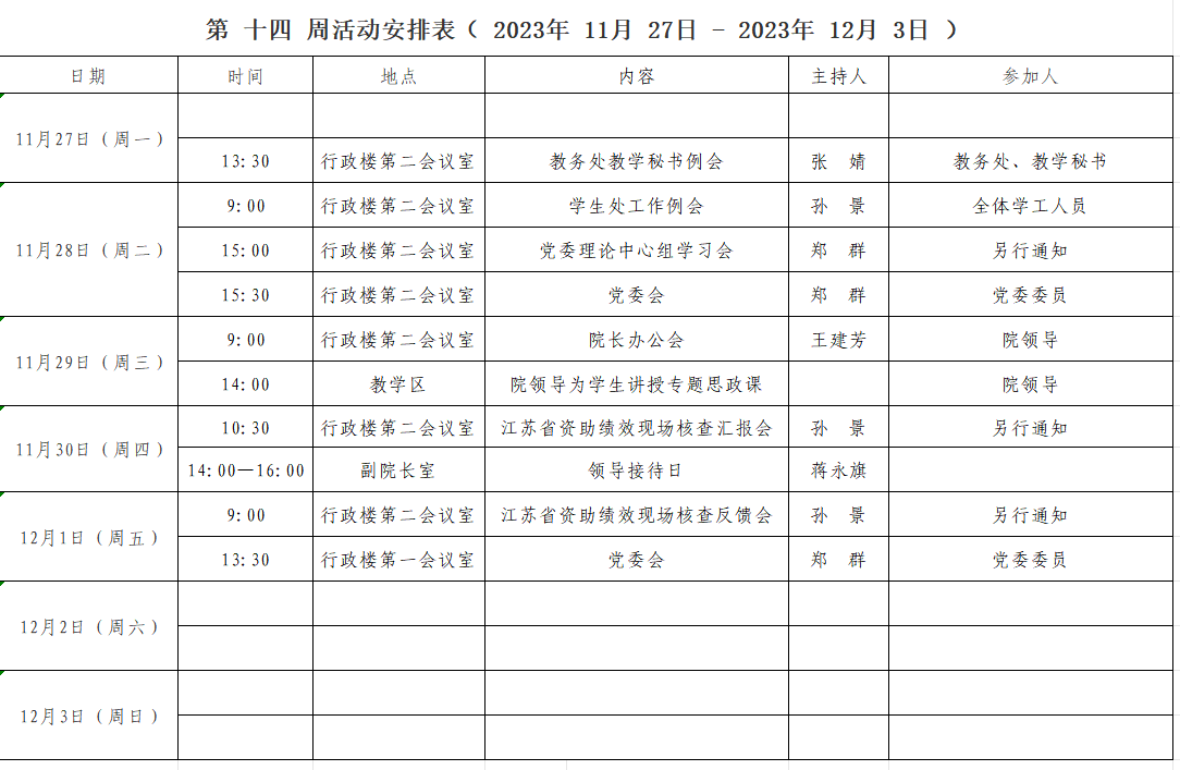 第 十四 周活动安排表( 2023年 11月 27日 - 2023年 12月 3日 )