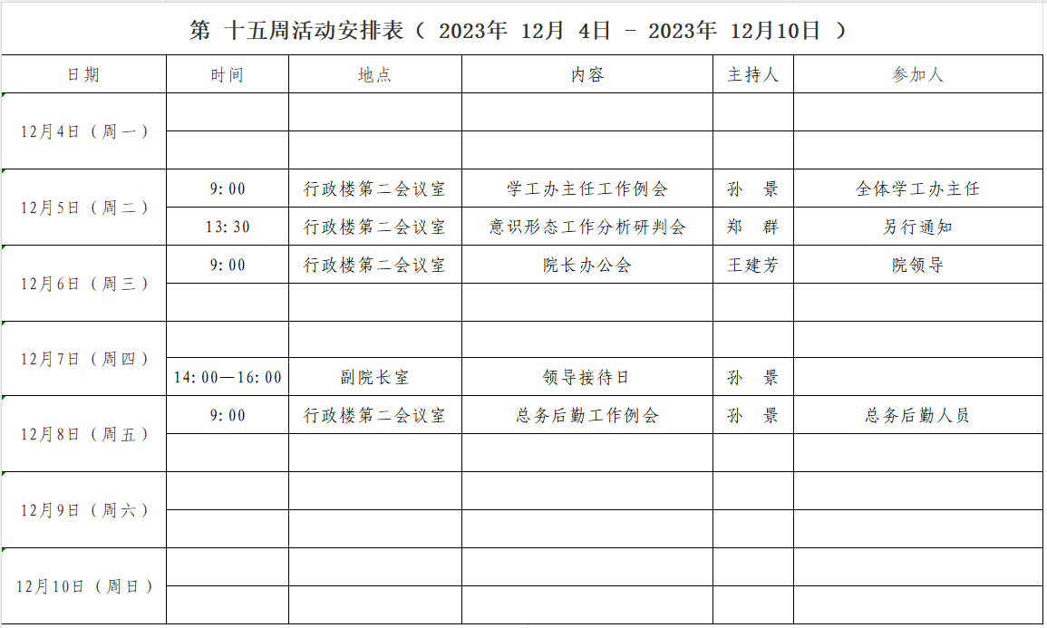 第 十五 周活动安排表( 2023年 12月 4日 - 2023年 12月 10日 )