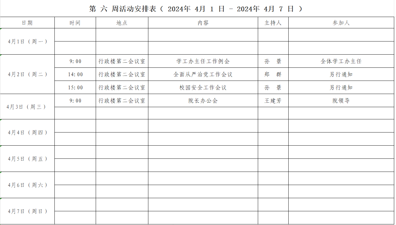 第 六 周活动安排表( 2024年 4 月 1 日 - 2024年 4 月 7 日 )