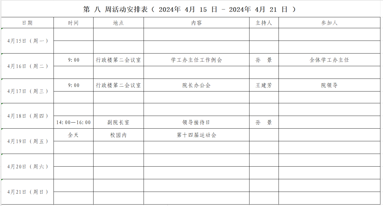 第 八 周活动安排表( 2024年 4 月 15 日 - 2024年 4 月 21 日 )