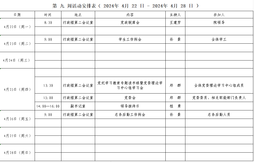 第 九 周活动安排表( 2024年 4 月 22 日 - 2024年 4 月 28 日 )
