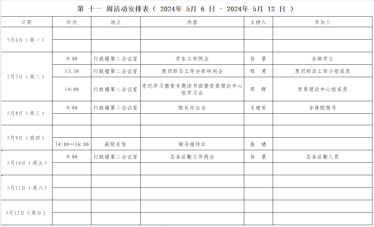 第 十一 周活动安排表( 2024年 5 月 6 日 - 2024年 5 月 12 日 )