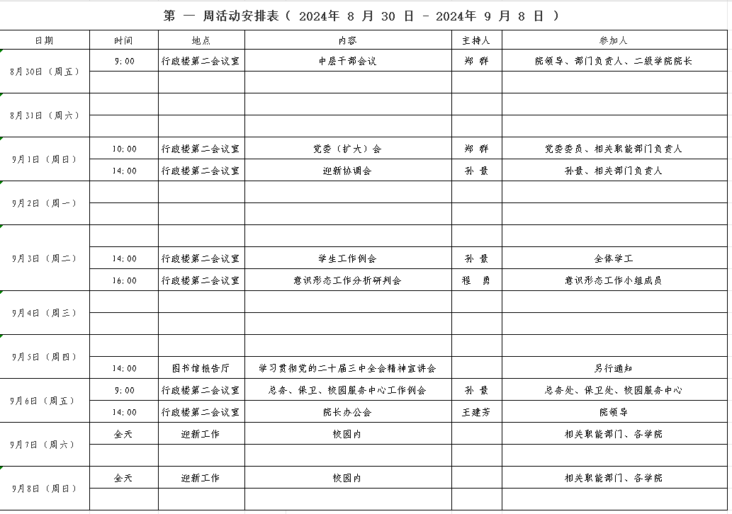 第 一 周活动安排表( 2024年 8 月 30 日 - 2024年 9 月 8 日 )