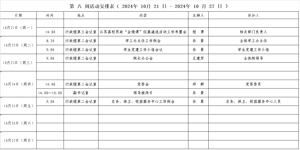 第 八 周活动安排表( 2024年 10 月 21 日 - 2024年 10 月 27 日 )