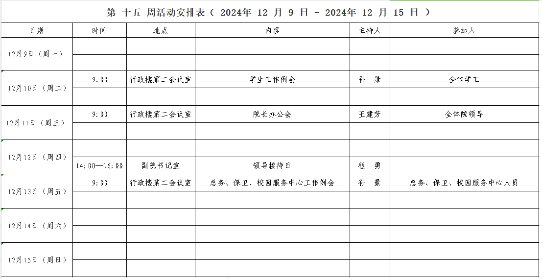 第 十五 周活动安排表( 2024年 12 月 9 日 - 2024年 12 月 15 日 )