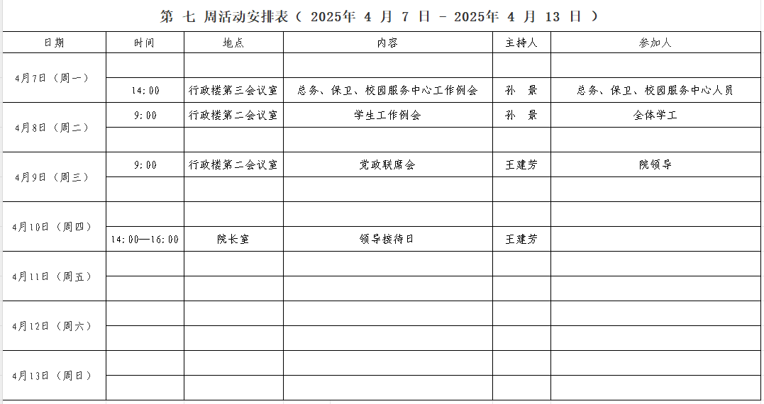第 七 周活动安排表( 2025年 4 月 7 日 - 2025年 4 月 13 日 )