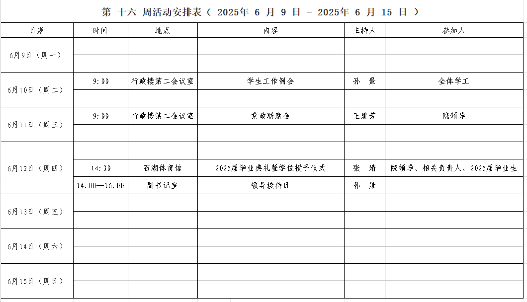 第 十六 周活动安排表( 2025年 6 月 9 日 - 2025年 6 月 15 日 )