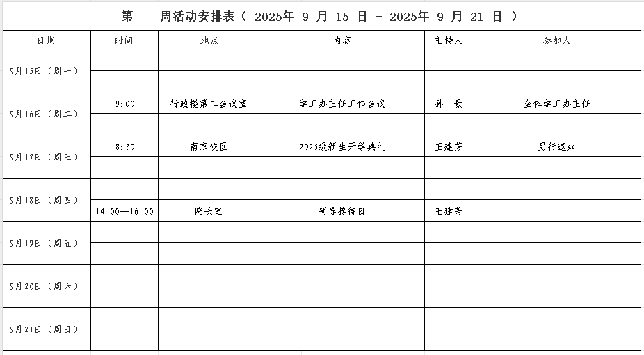 第 二 周活动安排表( 2025年 9 月 15 日 - 2025年 9 月 21 日 )