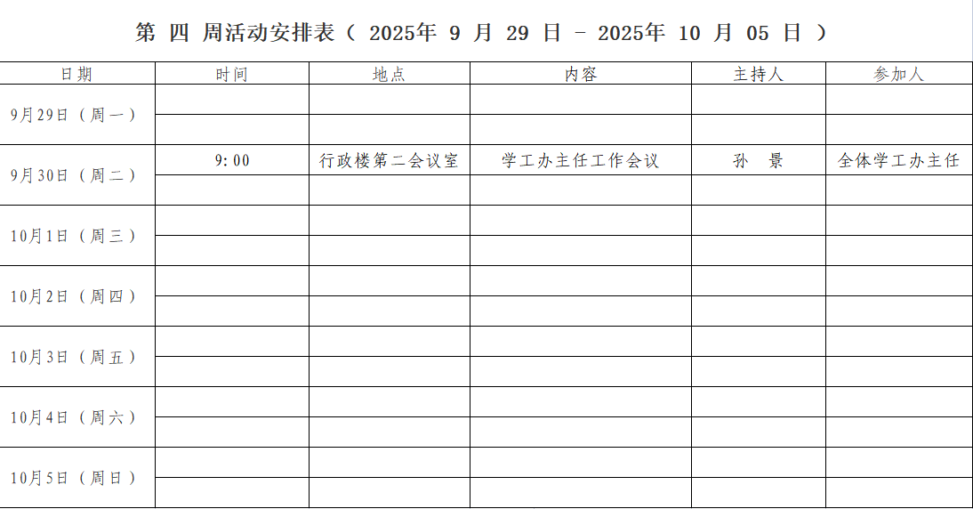 第 四 周活动安排表( 2025年 9 月 29 日 - 2025年 10 月 05 日 )