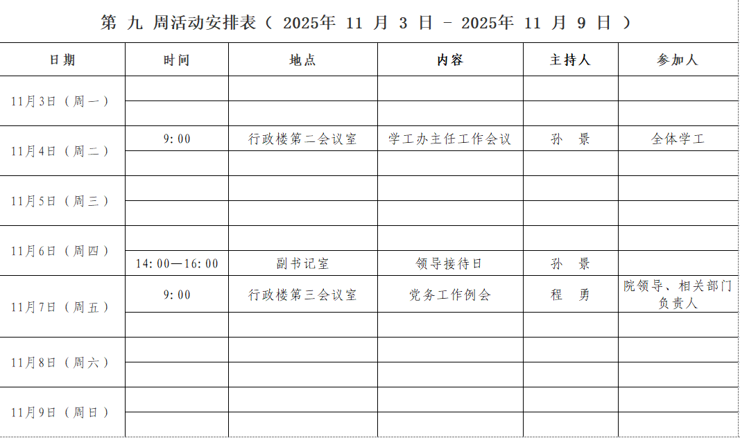 第 九 周活动安排表( 2025年 11 月 3 日 - 2025年 11 月 9 日 )