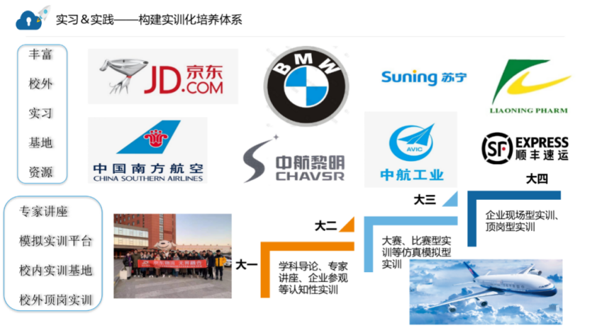 物流管理专业重视学生的实践教学与创新创业能力培养,打造“模拟实训平台+校内实训基地+校外顶岗实训”的全方位实践教学体系。而且,本专业先后与中国航发沈阳黎明发动机有限公司、辽宁通用航空研究院、沈阳苏宁物流园、沈阳京东物流等多家单位签订校外实习基地,深入推进校企合作、产教融合,多层次、多形式人才培养模式。鼓励学生参加各种级别的创新创业项目和竞赛活动,将创新创业教育融入学生培养全过程,全面提升学生的创新创业能力。
