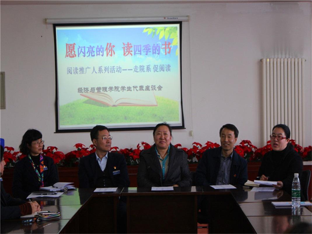 目前经管学院各专业分别组织了师生座谈会,4月11日上午党委书记吴景泰与国贸专业同学做考研交流。4月11日下午三点半,在图书管608室召开了与学生处、图书馆方面的专题座谈。出席座谈会的有:学生处副处长邢冰、图书馆党委书记王德甫、经管学院院长赵礼强、图书馆副馆长刘涛、经管学院党委副书记孙莉及经管学院2名2018届考研成功和准备考研的50余名学生。本次座谈会由孙莉主持。、