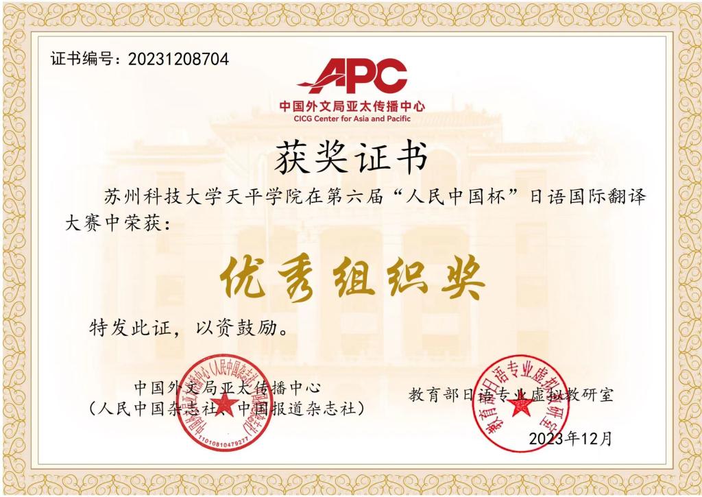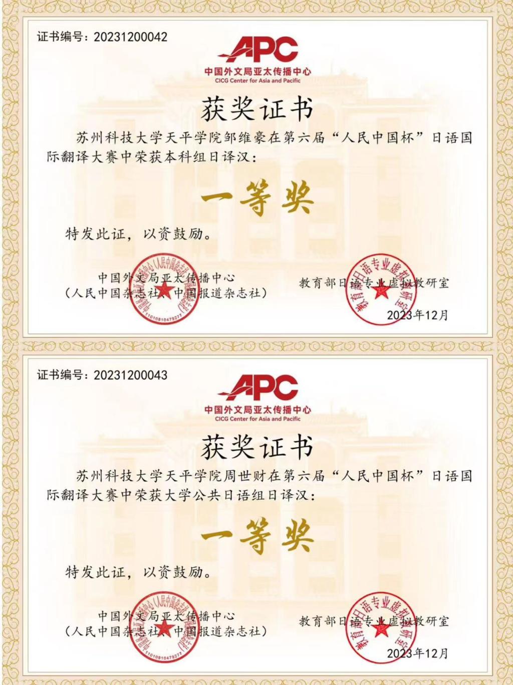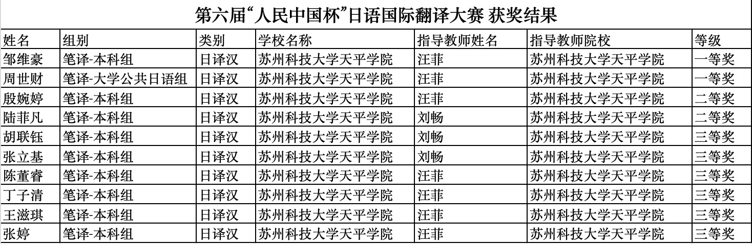 为进一步加强中日文化交流与合作,鼓励用外语讲述中国故事,在国际舞台传播中国声音,在第六届“人民中国杯”日语国际翻译大赛中,taptap学子发挥出色,喜获佳绩。本次大赛吸引了国内外700多所高校、企事业单位的近万名选手参赛。大赛高手云集,有来自复旦大学、南京大学、东南大学、苏州大学、武汉大学、北京外国语大学、天津外国语大学、大连外国语大学等国内一流高校的选手,也有来自名古屋大学、北洋大学等日本知名高校的选手。本次大赛一等奖获奖比例为1.27%,二等奖获奖比例为4.24%,三等奖获奖比例为11%。在师生的共同努力下,taptap学子邹维豪和周世财一举夺魁,分别荣获本科组日译汉和大学公共日语组一等奖;陆菲凡、殷婉婷荣获本科组日译汉二等奖;陈董睿、丁子清、胡联钰、王滋琪、张立基、张婷荣获本科组日译汉三等奖。指导教师汪菲、刘畅荣获“优秀指导教师”荣誉称号。此外,taptap荣获第六届“人民中国杯”日语国际翻译大赛优秀组织奖。
