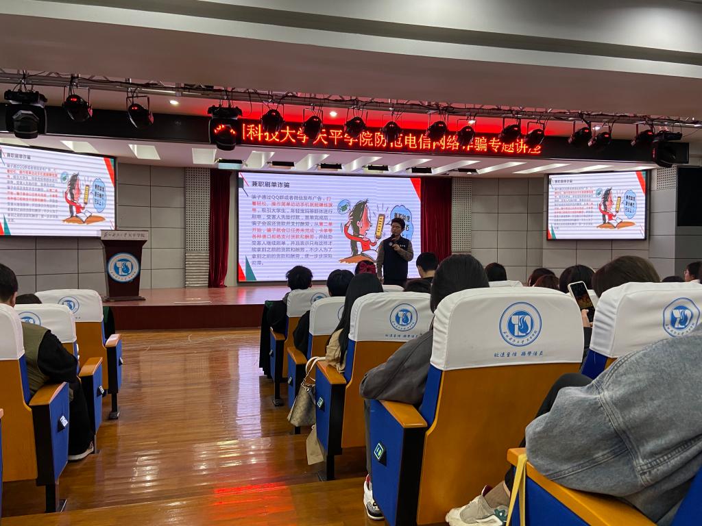 讲座中,朱老师首先针对全国电信网络诈骗情况、发展过程和常见的诈骗手段进行了具体描述,接着通过以案说骗、借例说法等方式,分析了电信网络诈骗的不同手段和各自特点,如网络刷单、淘宝客服诈骗、校园贷等,并提醒学生要增强自我保护意识,不要轻易将银行卡卡号、短信验证码等重要个人信息告知他人,给出了“三个不”不信、不理、不汇款的防范建议,如遇有突发情况也可直接拨打110。