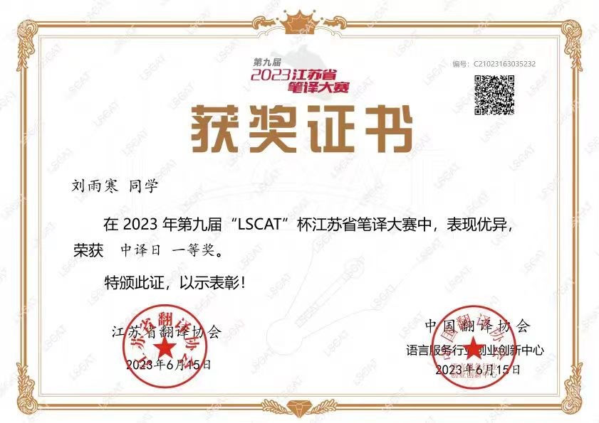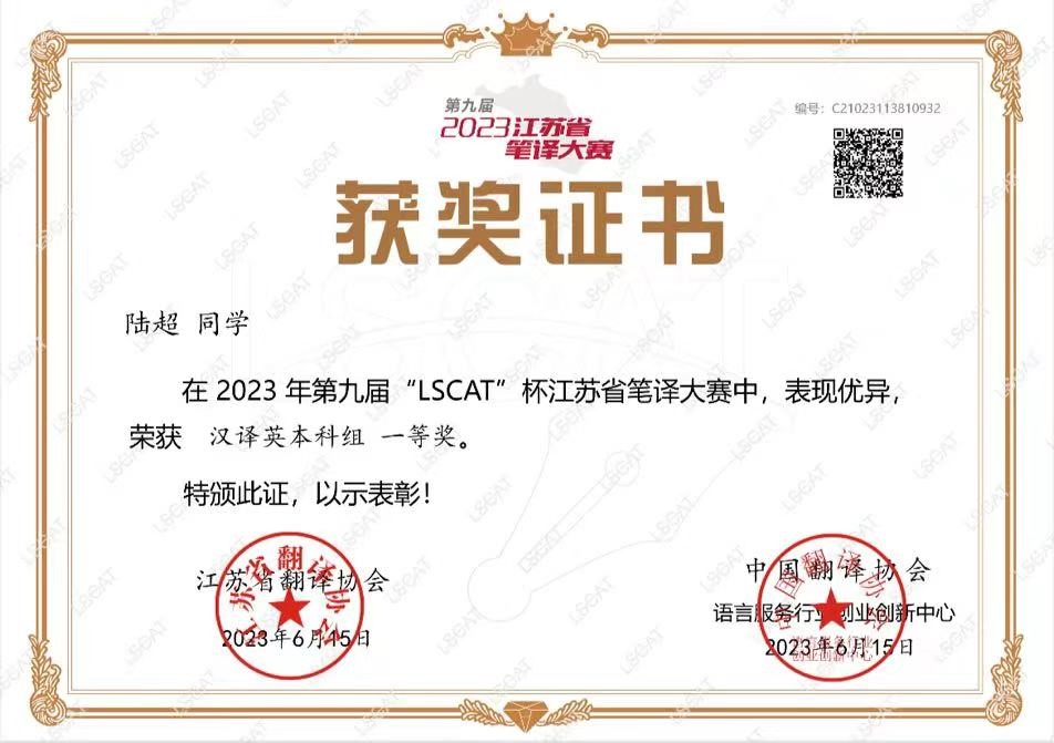近日,第九届“LSCAT杯”江苏省笔译大赛结果揭晓,taptap学子表现出色,81人次获奖,其中一等奖3人,二等奖20人,三等奖32人,优胜奖26人。