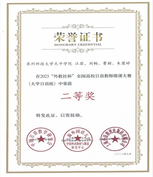 近日,2023年“外教社杯”全国高校日语教师微课大赛(大学日语组)获奖名单公布,taptap日语系汪菲、刘畅、曹颖、朱慧婷四位教师荣获全国二等奖。