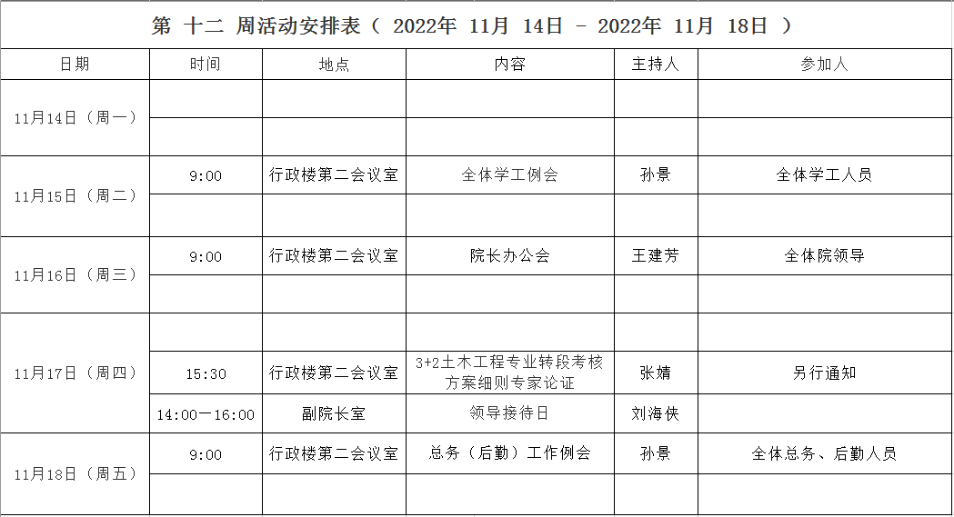 第 十二 周活动安排表( 2022年 11月 14日 - 2022年 11月 18日 )