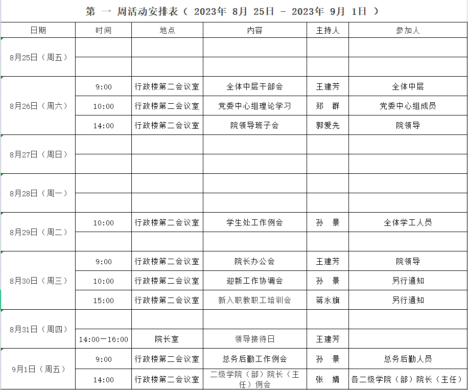第 一 周活动安排表( 2023年 8月 25日 - 2023年 9月 1日 )