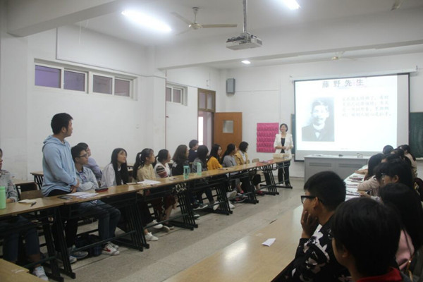 秋风乍起,卷了阵阵寒意,秋叶簌簌落下,带着对伟大生命的敬意,鲁迅先生逝世八十周年及夏目漱石先生逝世一百周年纪念日。十月十九日图书馆在3-201教室举办了纪念鲁迅读书交流研讨会。参与会议的有研究日本文学的李娇老师和天平学子们。 会议开始,由会长介绍主讲人李娇老师,之后李老师为同学们分别介绍了鲁迅先生与夏目漱石先生的生平,展示了多张鲜为人知的照片。又深度解析了鲁迅先生的《藤野先生》和《伤逝》,与同学们探讨了如何建立良好的师生关系以及正确的爱情观婚姻观。其间,同学们积极发言,参与讨论。最后,李老师又向同学们展示了多面不一样的鲁迅,使同学们又重新认识了鲁迅先生。