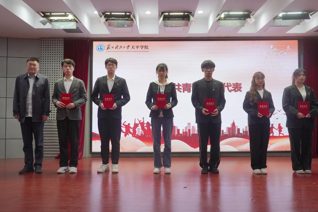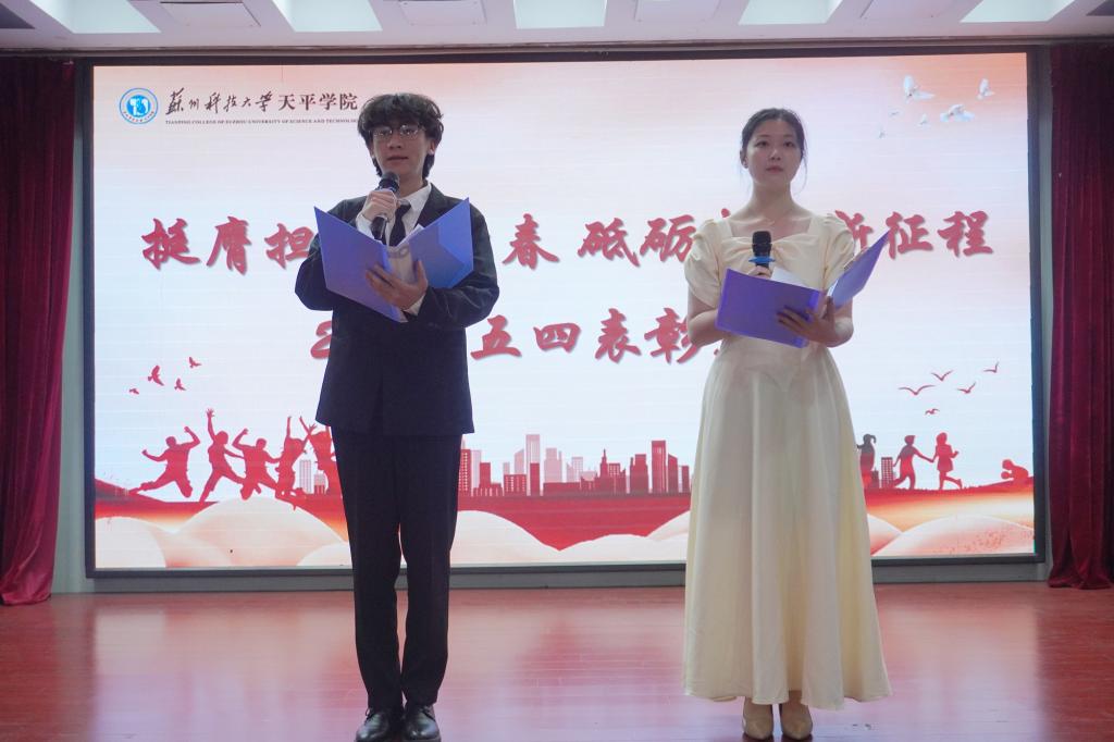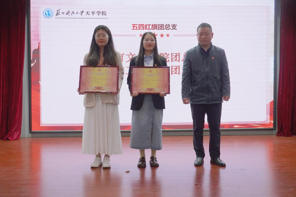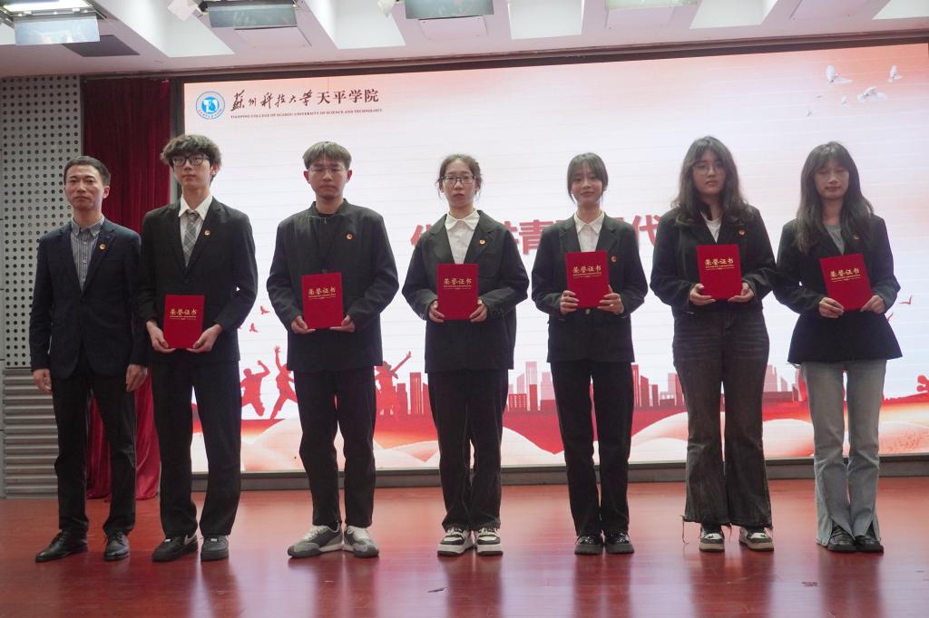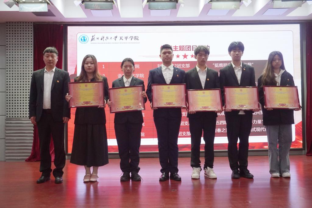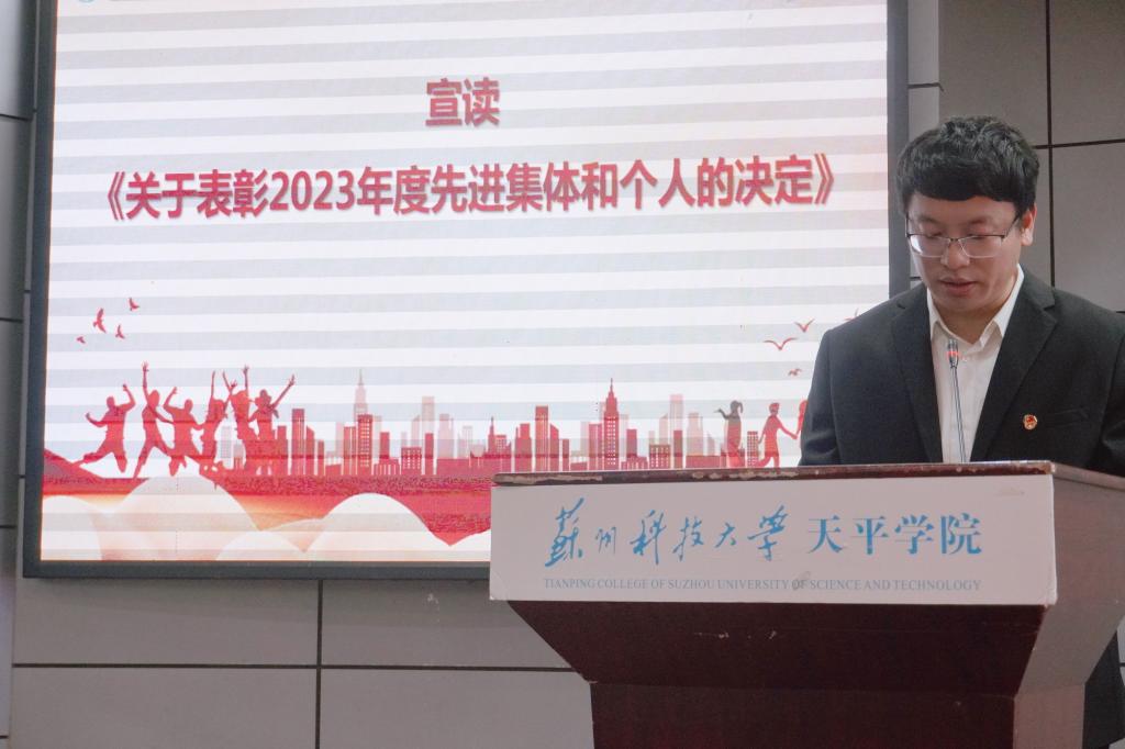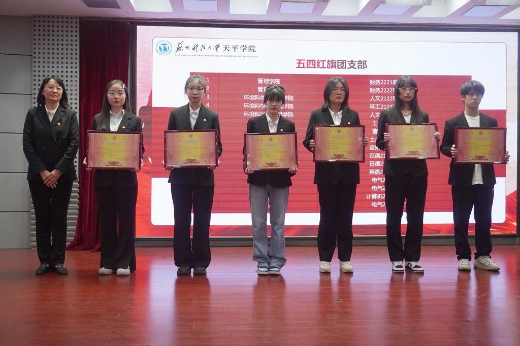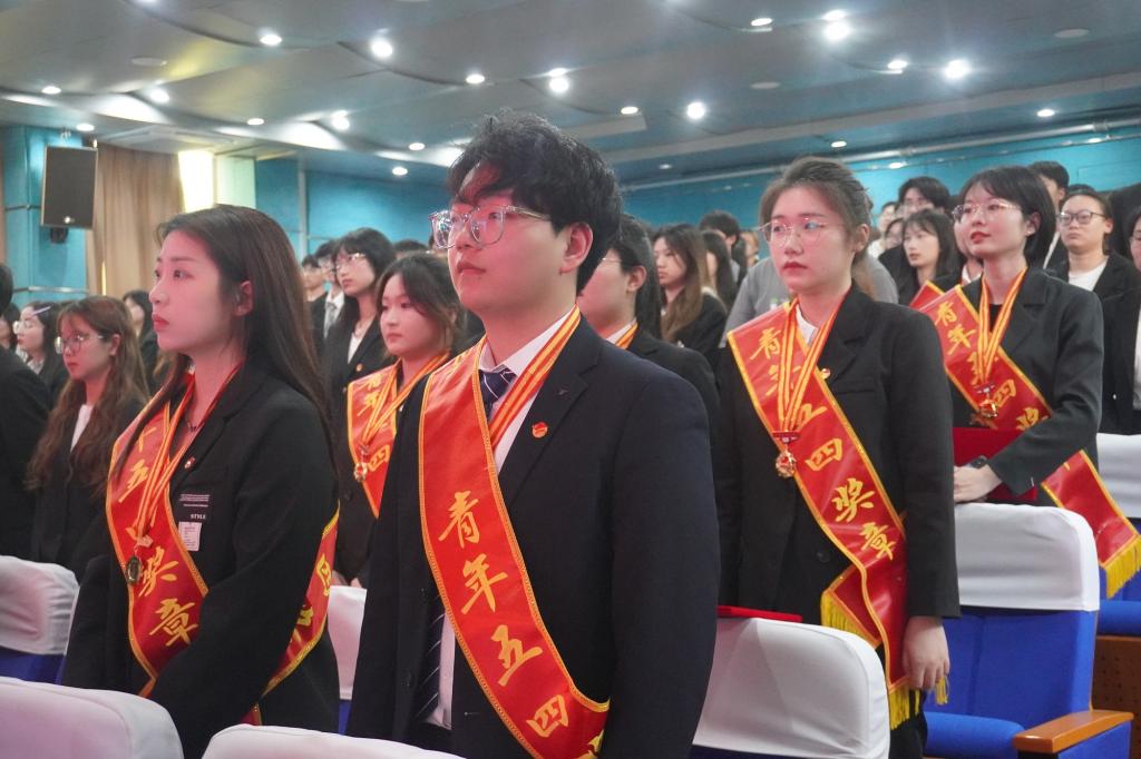 表彰大会在激昂的国歌中拉开帷幕。院团委副书记刘建琦宣读了《关于表彰2023年度院“五四红旗团总支”、“青年五四奖章”等先进集体和优秀个人的决定》。语言文化学院团总支、土木工程学院团总支荣获2023年度院“五四红旗团总支”称号,财务2221班团支部等16个团支部荣获2023年度院“五四红旗团支部”称号,郑雪莲等14名青年荣获2023年度院“青年五四奖章”称号,孙恒等65名青年荣获2023年度院“优秀共青团干部”称号,陈中蒙等178名同学荣获2023年度院“优秀共青团员”称号,财务2122班团支部“挺膺担当 传承有我”等8个项目荣获“优秀主题团日活动”。现场领导为获奖集体和个人代表颁发荣誉证书、奖状。