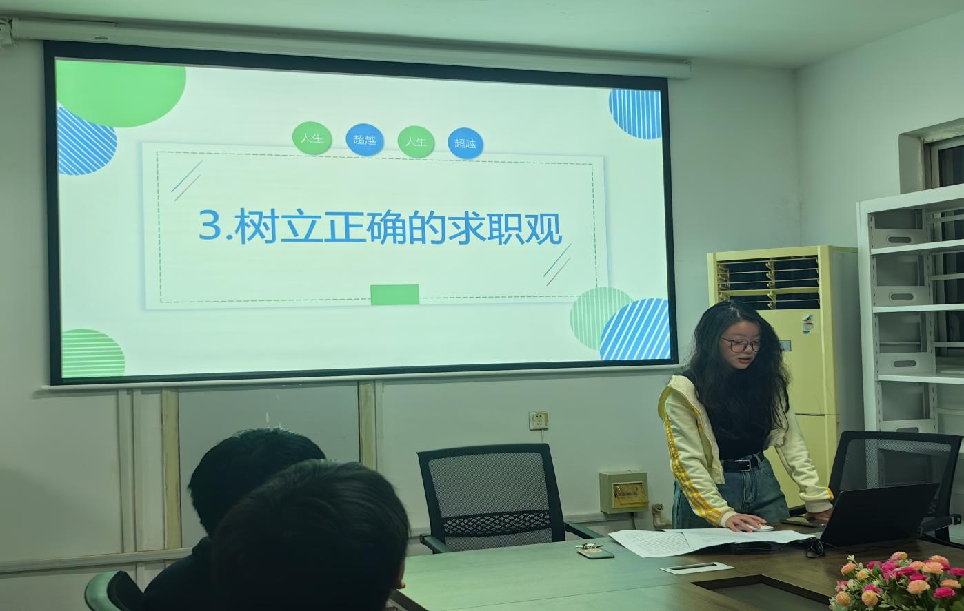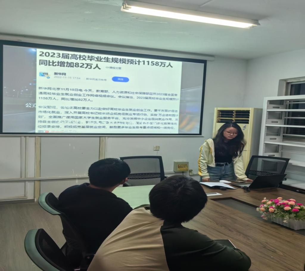 接下来,黄萌同学进行了职业规划指导,分享了一些求职观念和策略。她建议大学生要积极主动地寻找机会,关注行业动态,树立正确求职观,提前做好求职准备。此外,还强调了面试技巧的重要性,提醒学生们要注意言行举止,给面试官留下良好的印象。