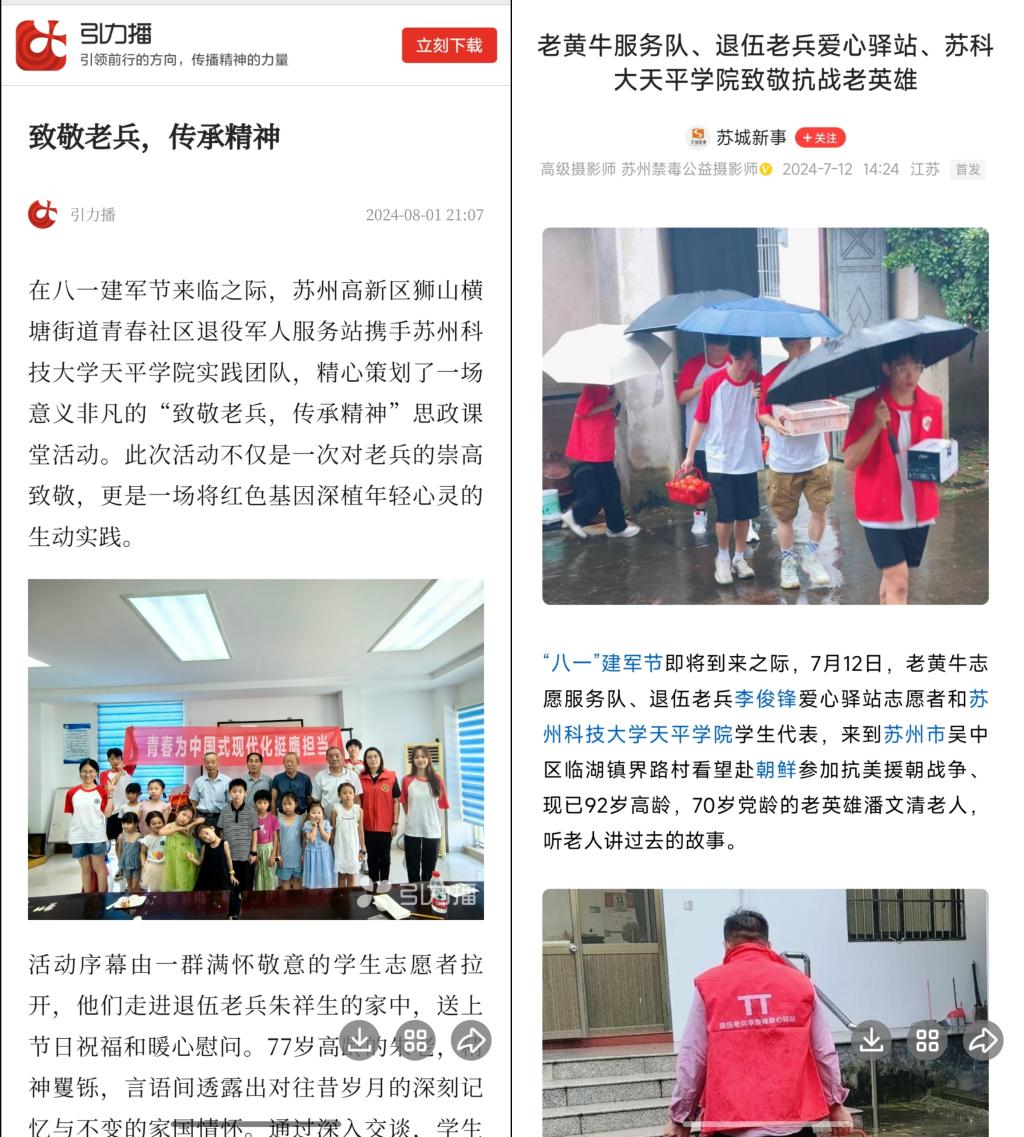 在红色文化中汲取奋进力量。“战史循迹”团队先后走访了福建省福鼎市、江苏省苏州市临湖镇界路村、横塘街道青春社区和横塘社区、常熟市军休事务所、盐城市响水退休事务所等地采访11位退伍老兵,其中参加的重大战役有抗美援朝、对越反击战、抗日战争等。团队联合青春社区共同举办了一场别开生面的“致敬老兵、传承精神”八一建军节主题活动。活动先后被网易新闻、苏城新事、引力波、常熟市退役军人事务所已经《现代苏州》杂志等媒体报道。