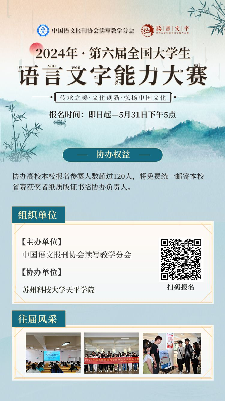 第六届全国大学生语言文字能力大赛由中国语文报刊协会读写教学分会主办,taptap点点已申请成为协办单位。校内选拔、赛前辅导等相关组织工作,由语言文化学院承担。
