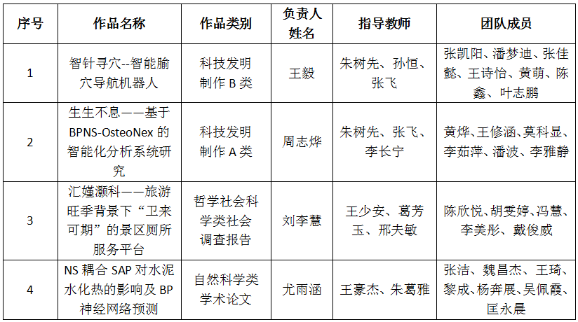 根据相关文件精神,学校组织开展了第十九届“挑战杯”课外学术科技作品竞赛申报遴选工作。组委会组织专家对参赛作品进行了评审,根据竞赛的评审规则,拟确定以下4件作品参加第十九届“挑战杯”课外学术科技作品竞赛江苏省选拔赛(排名不分先后)。现予以公示,公示期为2025年4月7日-4月11日。如有异议,请与院团委科创实践部联系。联系人:刘梦平,联系电话:68097825。