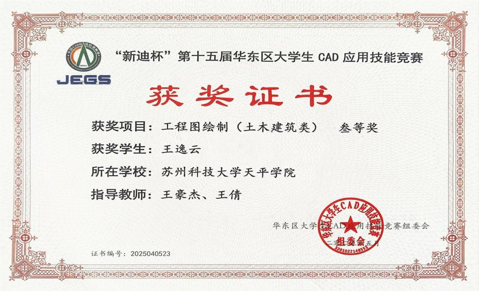 比赛现场气氛紧张而热烈,选手们全神贯注地投入到比赛中,熟练地运用CAD软件,将自己的设计思路转化为精准的图纸。他们在规定时间内完成了高质量的作品,充分展示了扎实的专业功底和创新思维。经过激烈角逐,梁炯森、王逸云凭借出色的表现赢得了评委们的一致认可,分别获得二等奖和三等奖。