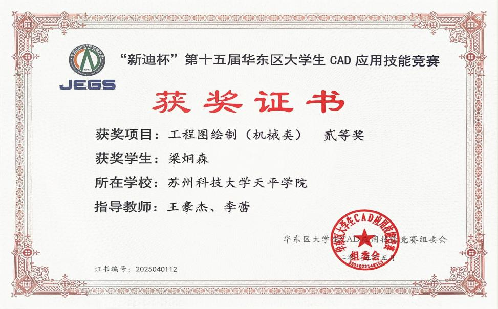 2025年5月17日,由全国CAD应用培训网络—南京中心、江苏省工程图学学会联合举办“新迪杯”第十五届华东区大学生CAD应用技能竞赛成功举行。本次竞赛由东南大学、南京林业大学、常州大学等15所院校共同承办。梁炯森、王逸云等同学凭借扎实的专业知识和精湛的操作技术,在众多参赛选手中脱颖而出,取得了优异的成绩。