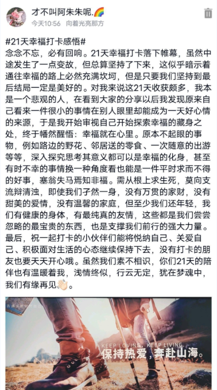 汉语z1923徐欣说:“渐渐不是在为打卡而打卡,开始享受自己完成学习任务时打勾的幸福和快乐。开始发现生活中的小美好,开始关注大自然,有平稳的生活节奏,不会盲目地活着,有着清晰的目标,感谢21天幸福打卡活动,希望自己可以一直幸福下去。”