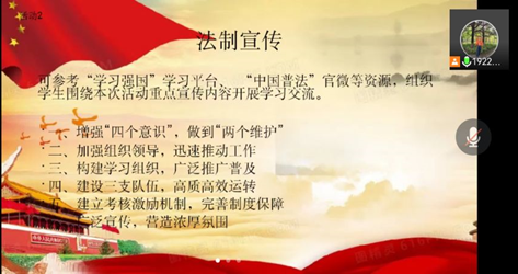 本次活动以习近平法治思想为核心,重点围绕民法典、家庭教育促进法、反有组织犯罪法、国家安全法、网络安全法、疫情防控、生命健康安全等法律法规,将法治教育与青春期教育、心理健康教育、安全自护教育、防欺凌教育等相融合,用网络教学、线上主题党团日活动、主题班会等形式,组织学生观看“名师空中课堂”专题讲座—法治教育栏目。