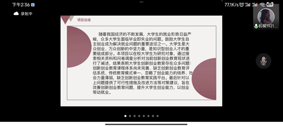 本次线上答辩活动的顺利完成,不仅让参与答辩的同学认识到自己研究上的不足与优化方向,也给观看本次答辩的同学提供了一次很好的学习机会。通过本次活动,taptap学子敢于创新、勇于实践的良好精神风貌得以展现,相信管理学院的同学们在这次答辩活动结束后,一定会激发新思路,踊跃加入到大学生创新创业的各项活动中。