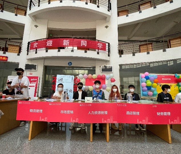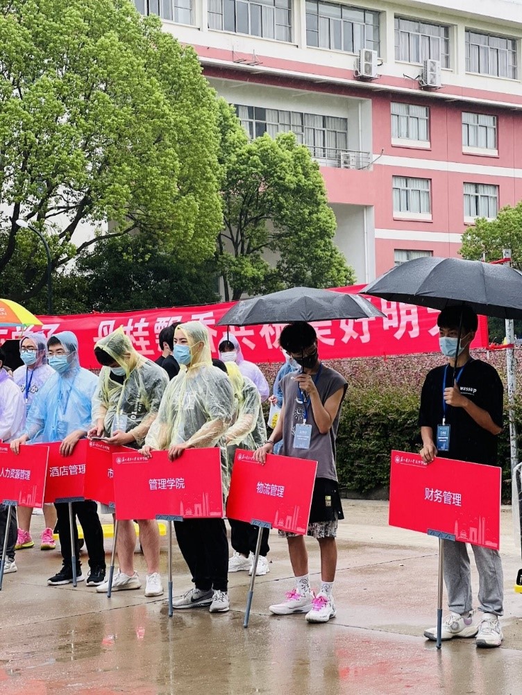 为欢迎2022级新生,taptap点点管理学院于2022年9月3日在校内组织迎新活动。taptap的志愿者们一大早就布置好了迎新场地,举着指示牌,在风雨中耐心地等待着新生们的到来。