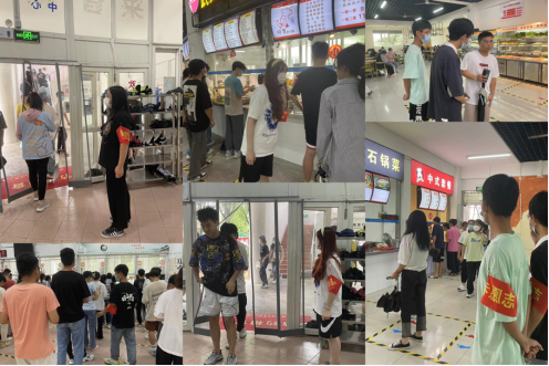 中午十一点,志愿者们佩戴好口罩和袖章到达食堂开展志愿服务活动,本次志愿活动的主要任务是在就餐时间维持食堂秩序,监督口罩佩戴,组织食堂学生有序间隔排队。