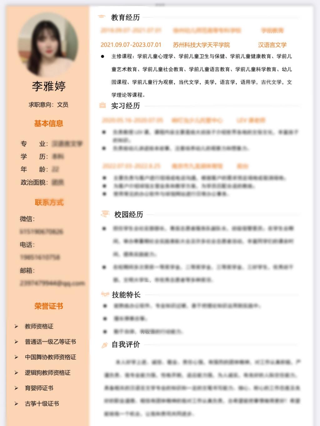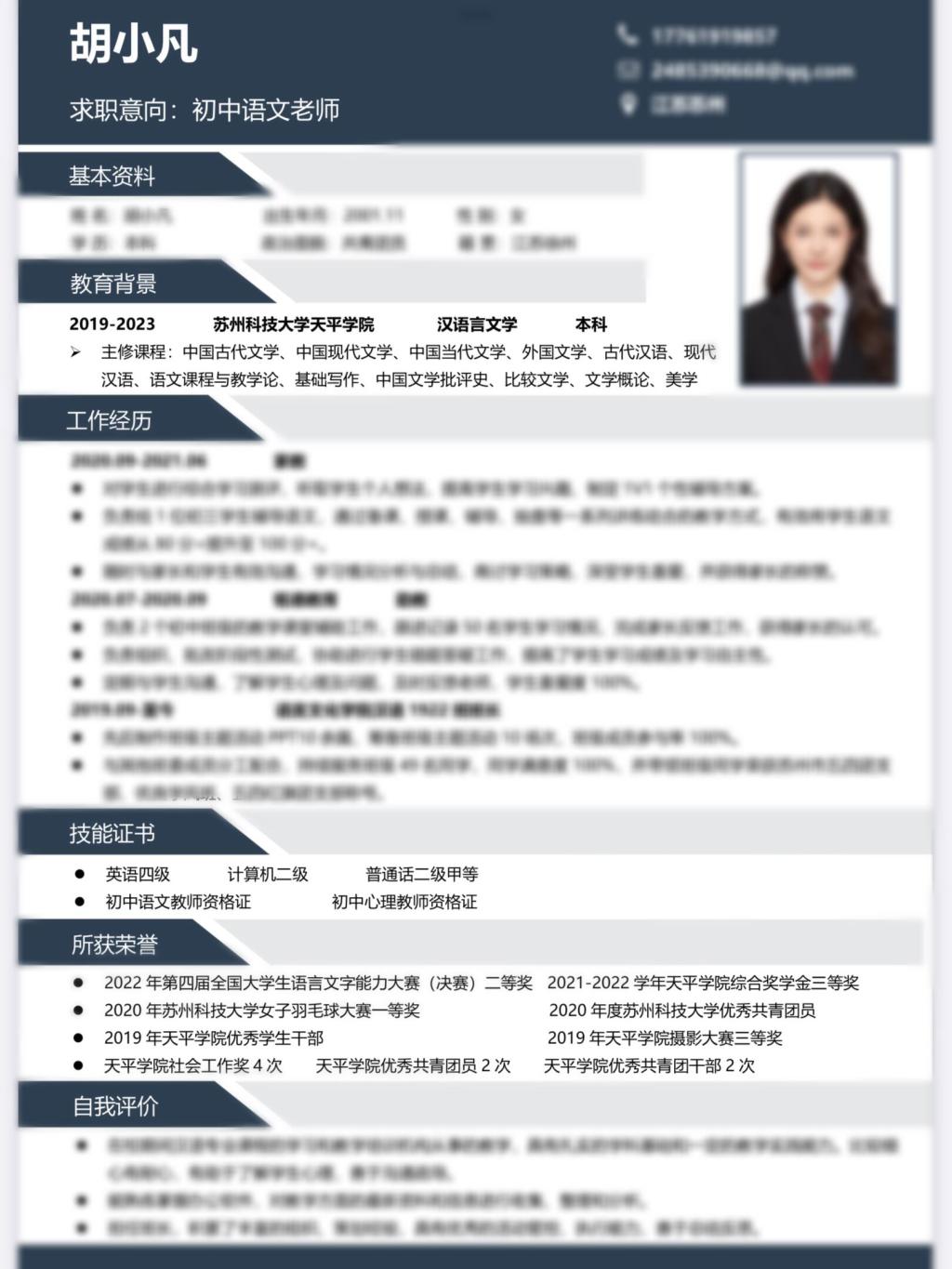 本次活动我们收集了60余份简历作品,经过专业老师、辅导员和学生干部的共同评选,在综合参赛选手求职意向行业分布的基础上,最终汉语1922班胡小凡、汉语转本1923班李雅婷简历作品脱颖而出,推荐参与校级天平学院简历大赛的评选。
