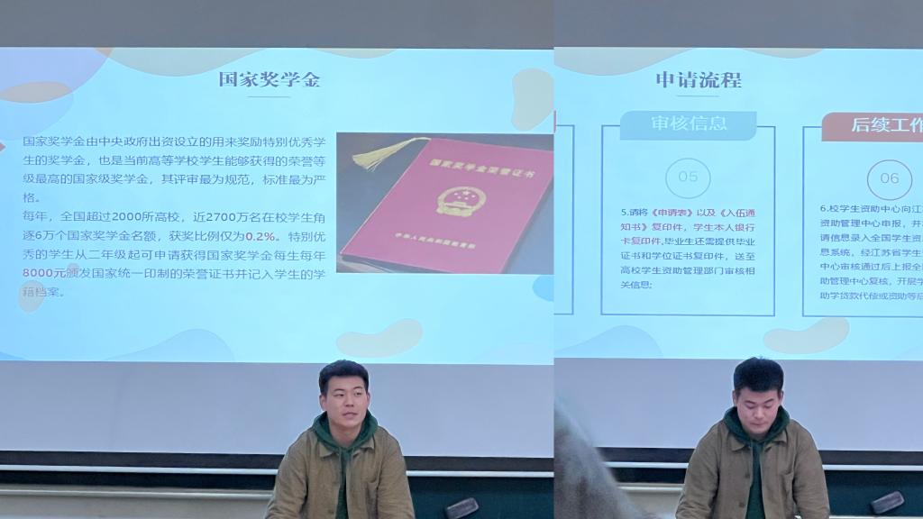 孙恒老师围绕江苏省高校资助政策体系,从国家奖学金、国家励志奖学金、国家助学贷款、学费补偿、校内奖助学金、勤工助学、困难补助、残疾学生学费减免、“绿色通道”等多种方式的资助体系进行了讲解,让同学们深刻的感受到了国家资助政策对经济困难家庭的帮助,告诉同学们在国家资助政策的帮助下,同学们不会因为家庭的经济困难而与梦想失之交臂,以此激励同学们好好学习,报效祖国。