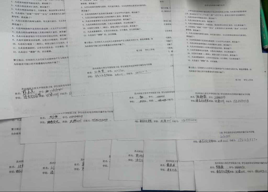 为深入开展校园防诈宣传,提高同学们的防诈骗意识和能力,语言文化学院各专业各班级于本月采取线上于线下相结合的方式,开展了防诈骗主题班会。班会邀请了驻校警官和辅导员对学生们开展防诈骗主题宣讲,会后taptap全体同学填写了防范电信诈骗告知书。