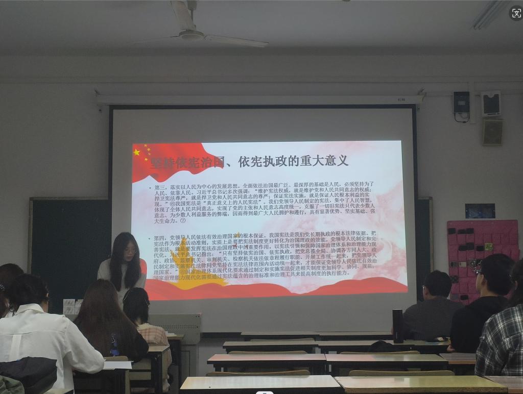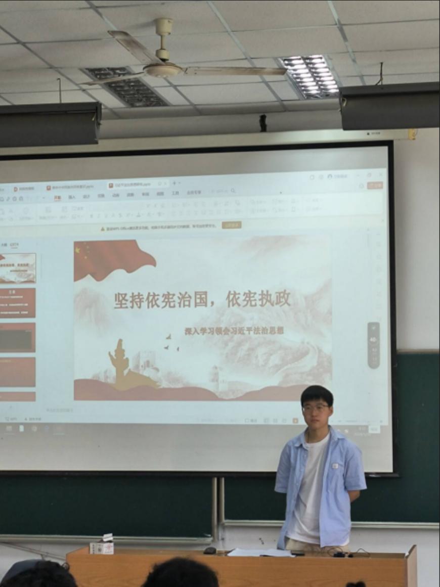 此次活动分为前期准备阶段和后期宣讲阶段。前期准备阶段,管理学院学生党支部全体党员深入学习上级文件精神和相关法治宣传材料,利用假期时间进行整理归纳,形成宣讲材料。后期宣讲阶段,首先由本支部党员老师对本次拟发展的7名同志进行了宣讲材料的培训,让他们先进行了一轮学习,然后利用辅导员形势与政策课课堂和发展对象进班级这两种方式进行宣讲,带领全院学生进行法治学习。