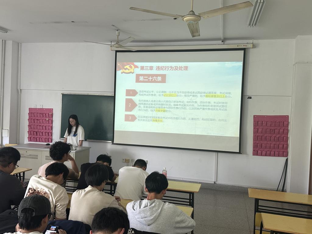 为深入贯彻落实党的教育方针,以党建引领学风,管理学院5月开展了学风建设系列活动之“党旗飘扬,学风蔚然”活动。此次活动旨在通过支部党员深入班级,引领同学们集中学习学生手册中《学生违纪处分规定》等规章条例,在学院营造积极向上、严谨求实的学习氛围,筑牢学生的诚信考试意识,提升学生的学习积极性。